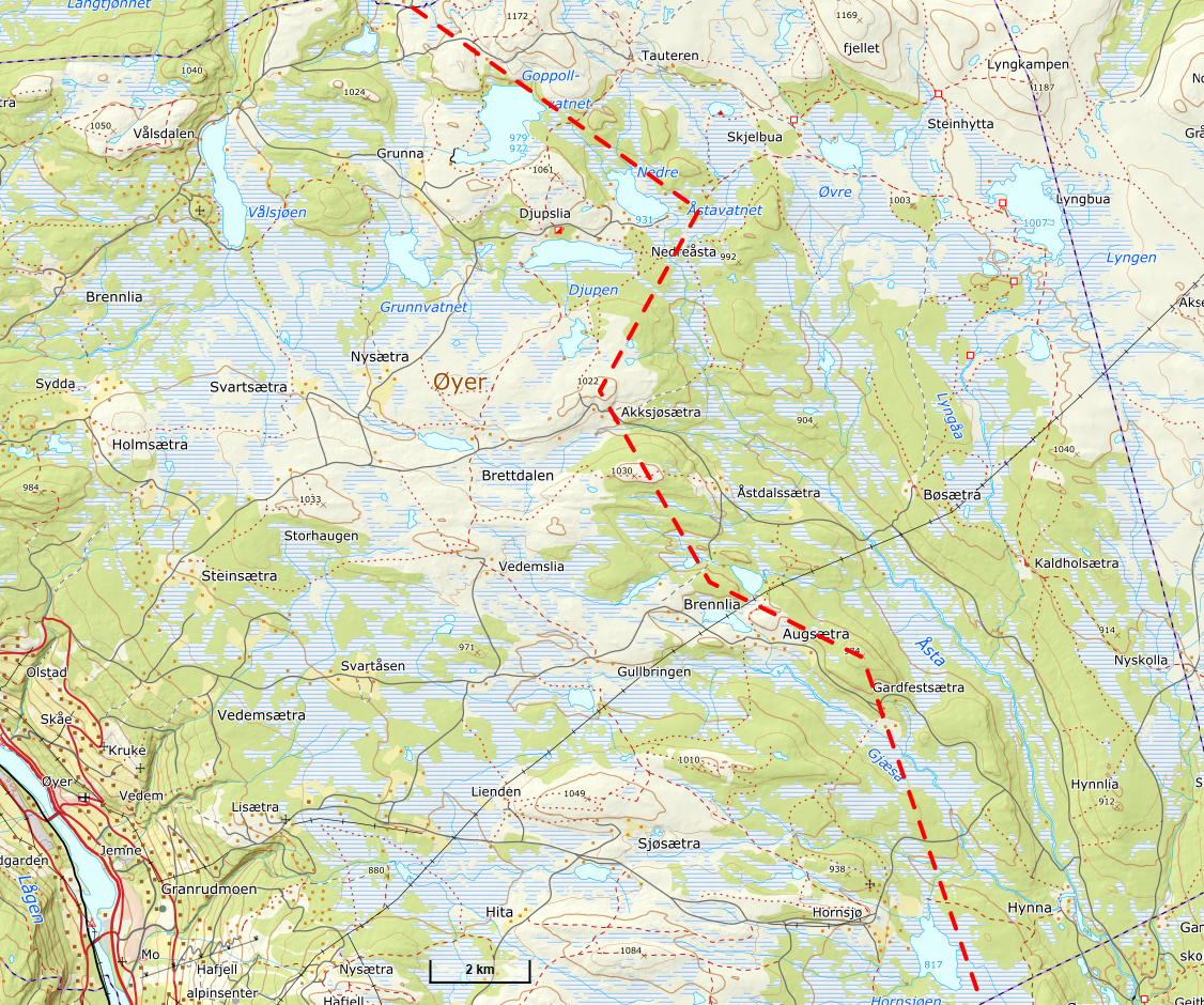 Området som tilhører Rondane villreinområde og som er omfattet av egen lokal forskrift er det som ligger til høyre for den rød stiplede linjen på bildet nedenfor: